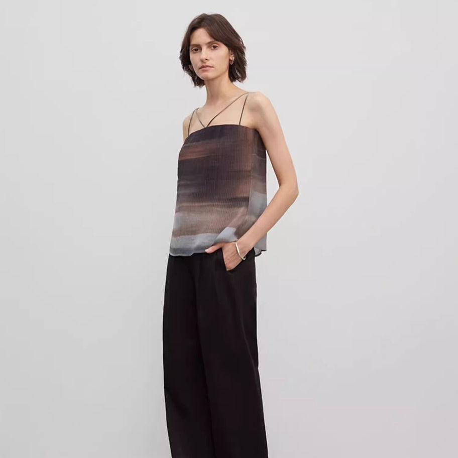 Creating a fashionable silhouette, low-waisted, high-definition tailoring combined with a floor-length slightly tapered pants, loose, neat, concise and generous. Combining double pleat layered space + side seam forward design, beautifying leg shape, slimming and slimming, effectively expanding and lengthening the proportions, interpreting a handsome fashion daily.